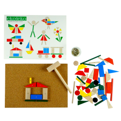 Drewniana zabawka edukacyjna, w której dziecko za pomocą młoteczka i gwoździków przybija kolorowe elementy do korkowej tabliczki, tworząc różne wzory i obrazki.