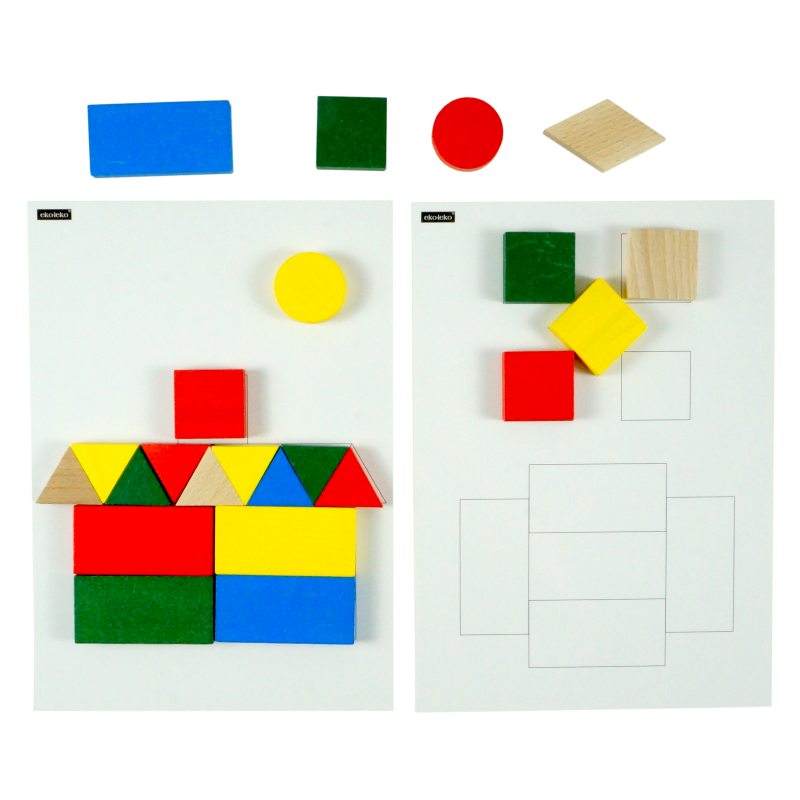 „Mozaika geometryczna” to zestaw kolorowych figur geometrycznych wykonanych z drewna, które dziecko układa na kartonikach ze wzorami, tworząc różnorodne wzory i kompozycje.