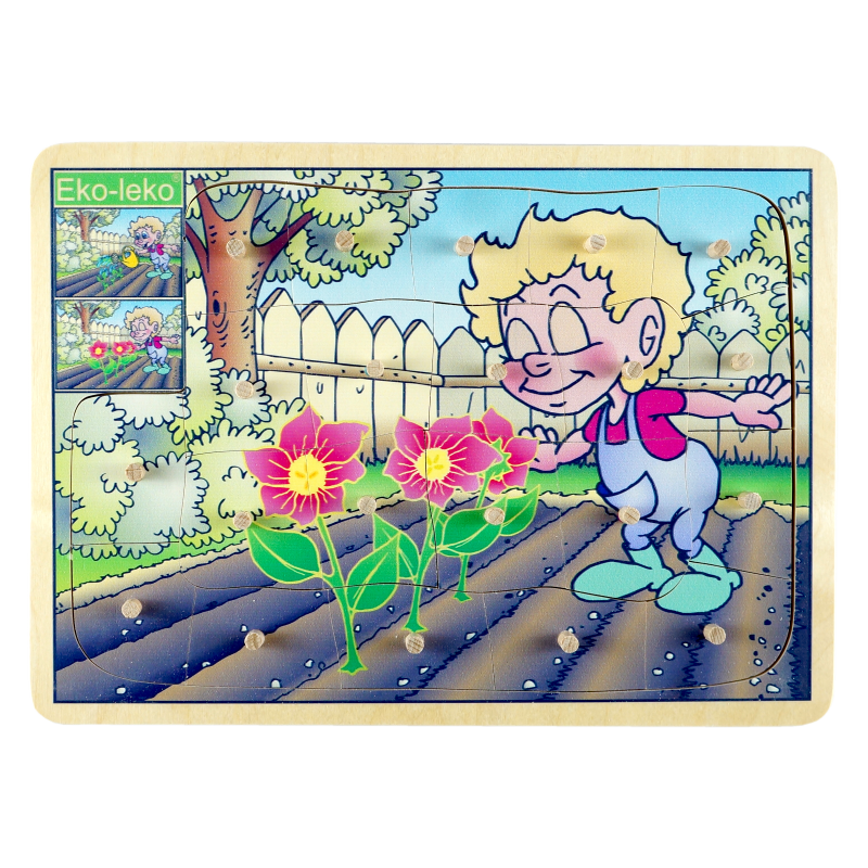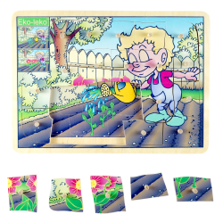 Drewniane puzzle składające się z trzech ilustrowanych warstw, które obrazują etapy wzrostu roślin.