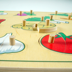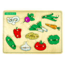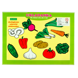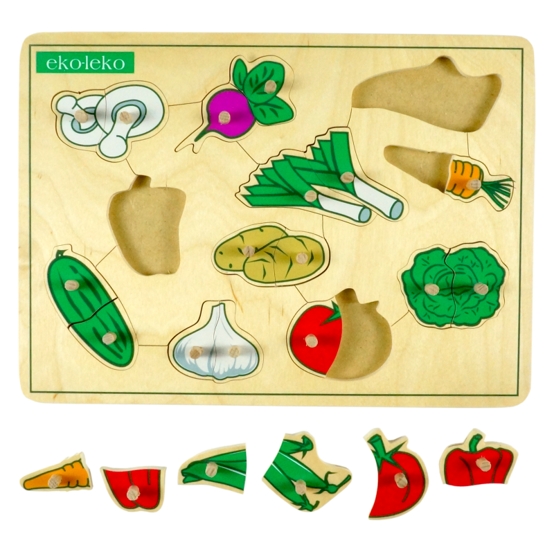 Drewniana układanka przedstawiająca warzywa.
